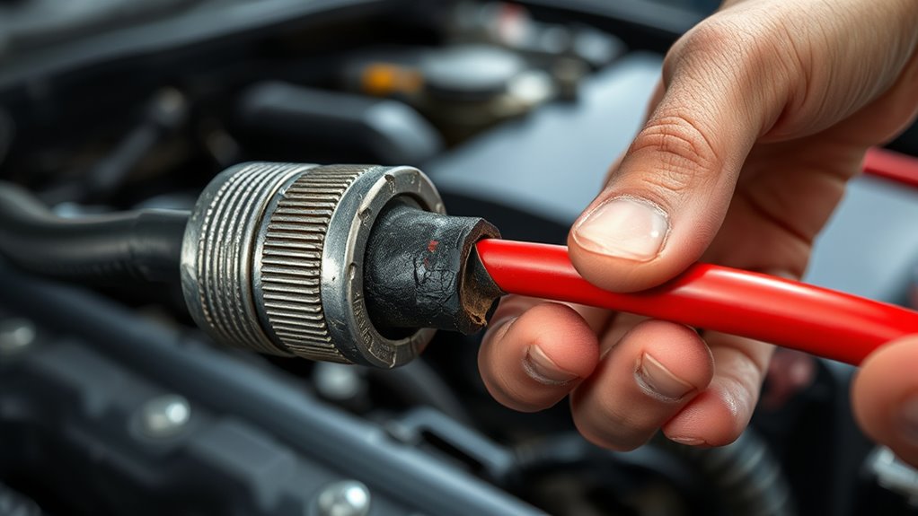 You’ll need essential tools like a wrench or socket set to loosen the battery terminals, especially to address corrosion. A wire brush helps clean corrosion from battery terminals, improving connection quality. For cable insulation repair, keep wire cutters and electrical tape handy to trim damaged insulation and secure repairs. These tools guarantee you can replace cables safely, tackle corrosion, and maintain a solid connection without needing professional help.