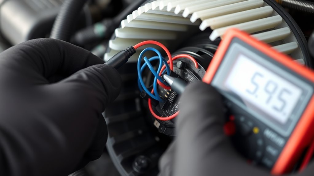 Yes, you should disconnect the battery before inspecting wiring to guarantee battery safety. This prevents accidental short circuits or electrical shocks while you check the wiring around the blower motor. Always turn off the vehicle and disconnect the negative terminal first, then the positive. This simple step protects you and avoids damaging your vehicle’s electrical system during wiring inspection. Staying safe is essential when working with vehicle electronics.