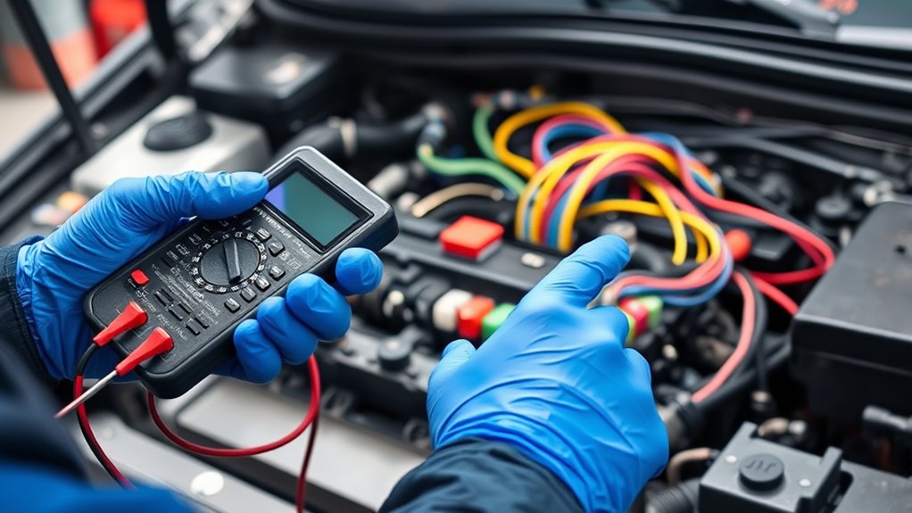 Start by checking your battery voltage; a fully charged battery should read around 12.6V, while anything below 11V indicates it might be dead. Confirm your terminals are clean, tight, and free of corrosion. Next, verify the ignition switch works by listening for sounds or testing power at the starter relay. Inspect fuses and wiring for damage or loose connections. If issues persist, understanding these steps will help you identify the root cause efficiently.