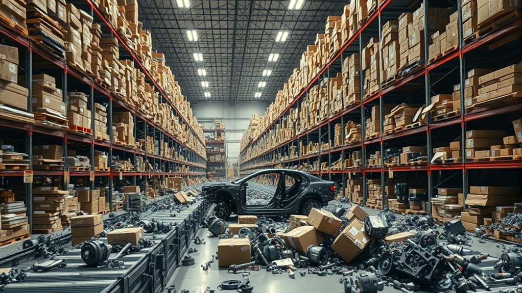 Supply chain disruptions in auto parts are drastically affecting vehicle manufacturing and repair, especially with the rising demand for electric vehicles. You might notice delays or shortages caused by factory closures, raw material shortages, and geopolitical issues. To stay resilient, companies are diversifying suppliers and spreading sourcing across regions, which helps maintain production and repair schedules. If you want to understand how these strategies can protect your operations, keep exploring the latest solutions and industry trends.