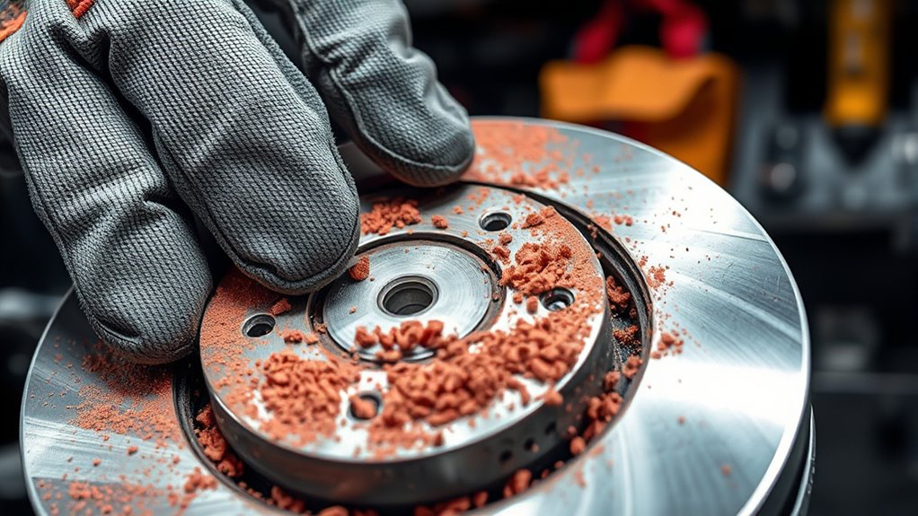 Brake dust contains harmful substances like asbestos and heavy metals that can cause serious respiratory issues over time. To protect yourself, always wear proper personal protective equipment such as respirators, safety goggles, and gloves. Make certain your workspace has good ventilation and use dust extraction systems to minimize airborne particles. Regularly clean the area with wet methods and dispose of waste properly. Staying aware of these safety measures is essential—continue to learn more to keep yourself safe on the job.