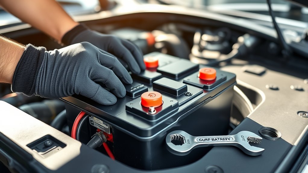 To maintain your gas car’s battery, regularly check for corrosion on the terminals and clean them with a baking soda and water mix using a wire brush. Apply a protective layer like petroleum jelly to prevent future buildup, and keep terminals tightly connected. Use a multimeter to verify your charging system works properly, and avoid overcharging. Staying attentive to your battery’s condition prolongs its life and ensures reliable starts—learn more tips to keep your car dependable.