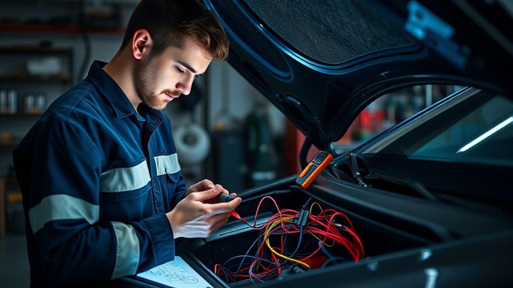 An automotive electrician specializes in diagnosing, repairing, and maintaining your vehicle’s complex electrical systems. They work on wiring, electronic modules, sensors, and advanced components like infotainment and driver-assistance features. Using specialized tools and diagnostic techniques, they quickly find issues like flickering lights or starting troubles, ensuring your car runs safely and reliably. If you want to understand the critical role they play in keeping your vehicle in top shape, stick around for more details.