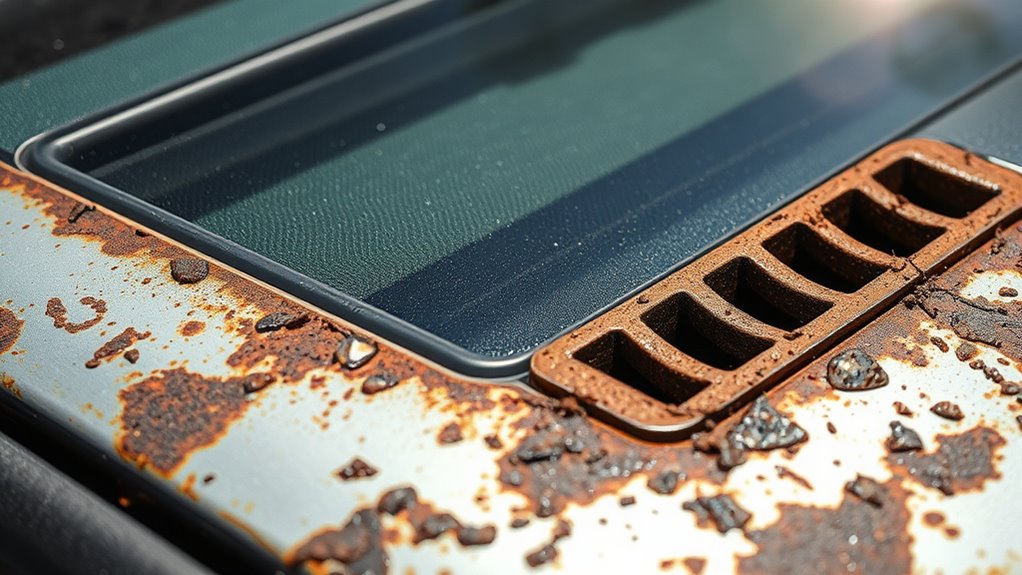 If your sunroof drains clog, water can pool inside your vehicle’s roof, creating a damp environment that accelerates rust formation. Debris like leaves and dirt often block these drains, so you should regularly inspect and clear them using compressed air or gentle flushing. Proper maintenance helps prevent rust, prolongs your sunroof’s life, and keeps your vehicle looking its best. Keep exploring to learn effective tips for maintaining your sunroof drains and avoiding rust issues.