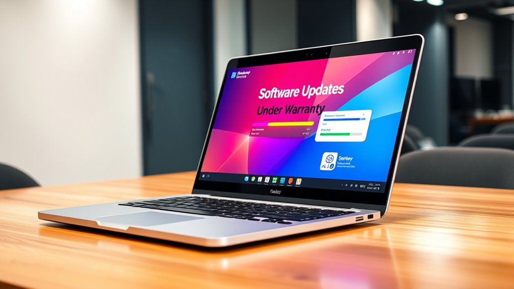 To guarantee your software stays secure and reliable, it’s important to perform updates while under warranty. Updates fix bugs, patch vulnerabilities, and add new features, helping your system run smoothly. You can usually get notifications or check manually for updates through settings. Support teams are available if you encounter problems or need guidance. Keeping software current is critical—continue exploring to learn more about making the most of your warranty coverage.