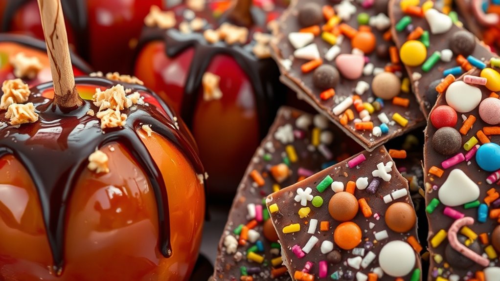 Halloween treats like caramel apples and candy bark are fun, creative options to enjoy with family and friends. You can dip tart apples in warm caramel, add toppings like nuts or sprinkles, and even try chocolate drizzles for extra flair. Candy bark lets you spread melted chocolate and decorate with candies or pretzels, then break into pieces. These treats are easy to prepare ahead and perfect for creating festive memories—keep going to discover more ways to make your celebration special.