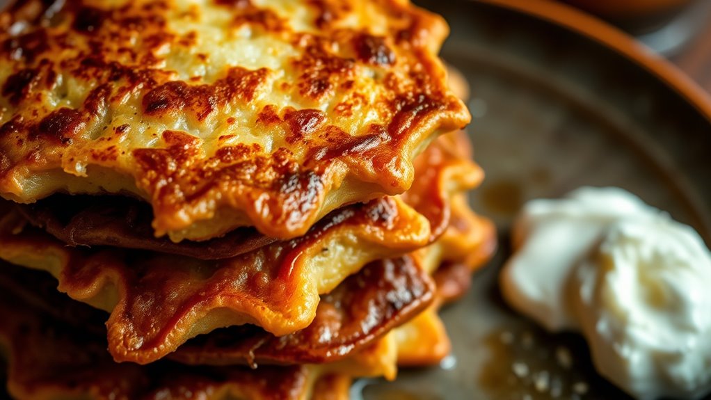 During Hanukkah, latkes are more than just a delicious treat—they’re a symbol of tradition and resilience. You’ll find yourself reaching for your favorite recipe year after year, eager to recreate that perfect crispy edge and tender center. The key to achieving this lies in mastering oil frying and sticking to traditional recipes passed down through generations. When you fry latkes in hot oil, you’re not just cooking; you’re honoring a history of perseverance. The sizzling sound and fragrant aroma fill your kitchen as you carefully place the batter into the oil, knowing this is a ritual that connects you to your ancestors. The choice of oil is essential—traditionally, people use vegetable oil or schmaltz because they can sustain high heat and produce that satisfying crunch. This method not only guarantees the latkes turn golden brown but also enhances their flavor without overpowering the delicate potato taste.