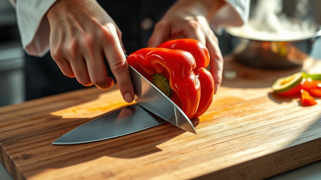 Have you ever wondered how professional chefs achieve perfectly sliced vegetables and uniform cuts? The secret isn’t just in talent; it’s in mastering proper knife skills, which include understanding essential cuts, practicing safe handling, and maintaining your tools. When it comes to knife safety, you need to be aware of how to handle your knife confidently and carefully. Always keep your fingers tucked in when holding the food, forming a claw grip that keeps fingertips safe from the blade. Avoid rushing or distracted cutting, as even a moment of carelessness can lead to injuries. When you’re not using the knife, store it properly—either in a knife block or on a magnetic strip—to prevent accidental cuts and keep the blade protected. Sharpen your knife regularly because a dull blade requires more force and increases the risk of slipping, which can cause injuries. Proper knife maintenance isn’t just about safety; it also ensures your cuts are precise and efficient. Clean your knives immediately after use, avoiding dishwashers that can dull blades and cause corrosion. Use a gentle sponge and avoid abrasive scrubbers, which can damage the edge over time. Keep the blades dry and store them in a safe place to prevent rust and dulling. Developing good habits in knife safety and maintenance makes practicing cuts more effective and less hazardous.