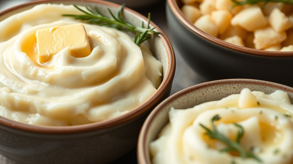 Discover three delicious mashed potato styles to suit any preference. For a classic version, use starchy potatoes like Russets or Yukon Golds paired with butter, cream, salt, and pepper for a silky texture. For a rustic approach, opt for chunkier potatoes like red or Yukon Golds, adding roasted garlic or bacon for extra flavor. To make it dairy-free, select sweet potatoes or Yukon Golds, then incorporate plant-based milks, herbs, and spices. Keep exploring for tips to perfect each variation.