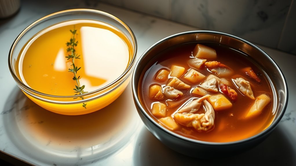 You might think one is healthier, but both stock and broth offer similar nutritional benefits—just with different flavor profiles. Ironically, their health differences are minimal; broth tends to be lower in calories and fat, making it slightly better for digestion. Stock, rich in gelatin, supports joint health. So, whether you choose flavorful stock or light broth, you’re fueling your body with wholesome goodness—no secret health risks involved.
