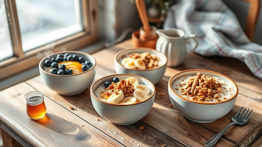 For a cozy winter breakfast, try customizing your oatmeal with seasonal fruits like berries or apples, warming spices such as cinnamon, and nutritious swaps like almond milk or Greek yogurt. Add toppings like nuts, dried fruits, honey, or nut butters for extra flavor and texture. Preparing overnight oats or reheating leftovers can save your busy mornings. Keep exploring more ideas to make every breakfast both nourishing and comforting throughout the chilly months.