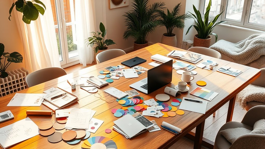 Have you ever struggled to visualize your design ideas clearly? Creating a mood board can be your game-changer. It’s a visual tool that brings your concepts to life, helping you see how everything comes together before making any commitments. To start, focus on establishing a cohesive color palette. Think about the mood you want to create—calm and serene, bold and energetic, or somewhere in between. Collect images, fabric swatches, and paint chips that reflect these colors. Don’t just pick hues randomly; aim for a harmonious blend that sets the tone for your space. This color palette will serve as your guiding star, ensuring your choices stay consistent from furniture to accessories.