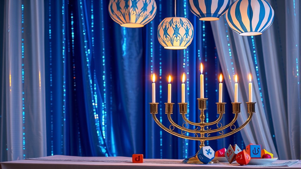 Hanukkah decor transforms your home into a festive space filled with warmth and tradition. As you prepare for the holiday, you realize that the right decorations can truly bring the season to life. Festive lighting plays a vital role in setting the mood. Twinkling string lights in shades of blue and white drape across your windows, shelves, and mantel, creating a luminous backdrop that captures the holiday’s spirit. These lights aren’t just decorative—they evoke a sense of joy and celebration, making your home feel welcoming and bright. When paired with traditional symbols, such as dreidels, gelt, and menorahs, the lighting enhances the overall atmosphere, reminding everyone of Hanukkah’s rich history.