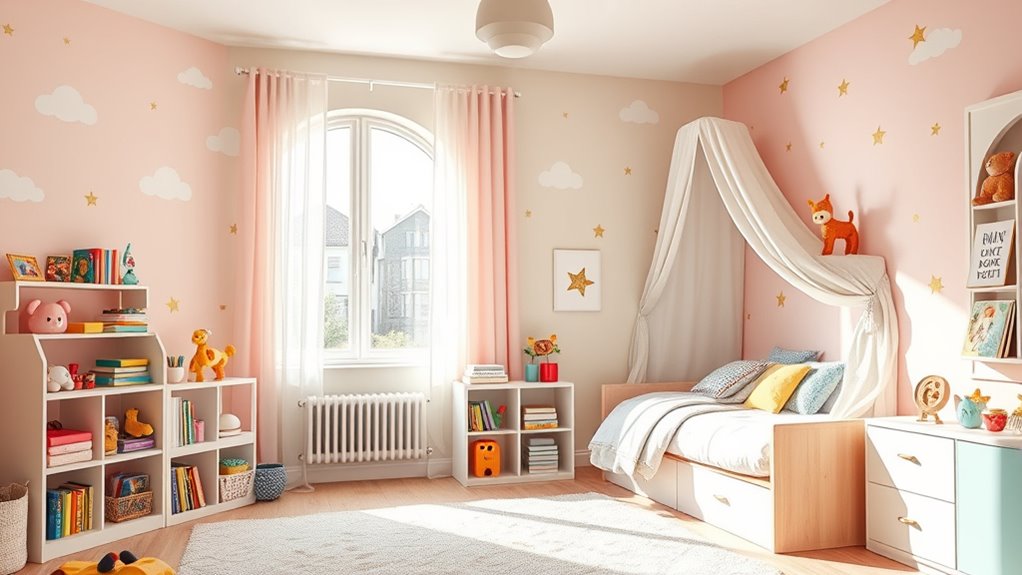 To update your child’s room as they grow, start by choosing flexible decorating themes that can evolve over time, like neutral colors or removable decals. Swap out bedding and accessories to reflect their changing interests. Improve lighting options with adjustable fixtures or task lighting to suit different activities. Regularly rework furniture placement to keep the space functional and fun, ensuring it adapts seamlessly to your child’s developing needs and style.