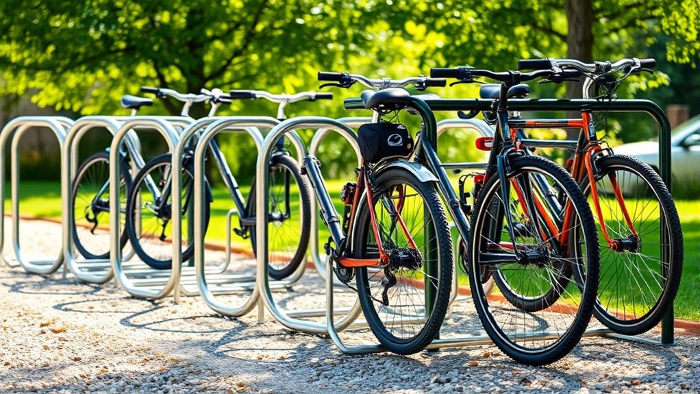Choosing a bike rack that’s easy to store and transport can make a big difference in your overall experience. I look for racks that fold or collapse easily, so they take up minimal space when not in use. The weight of the rack matters too—lighter models are simpler to handle during setup or when moving between locations. Quick-attach features or tool-free mechanisms are a bonus, allowing me to install or remove the rack without hassle. Integrated carrying handles or cases are great for portability, especially if I want to carry the rack on trips. Finally, I check the size and design to ensure it fits comfortably in my trunk, garage, or closet, making storage convenient and accessible whenever I need it.