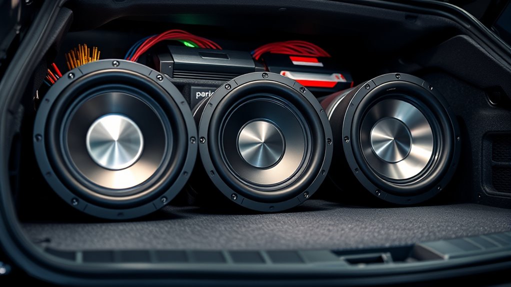 Subwoofer size and power directly influence sound quality by determining bass depth and clarity. Larger subwoofers, like 12 or 15 inches, produce deeper, more resonant bass, while smaller ones are more suited for tighter, punchy sounds. Higher power handling means louder, cleaner bass without distortion. I find that balancing size and power gives me the best sound experience, ensuring deep bass without sacrificing clarity or clarity.