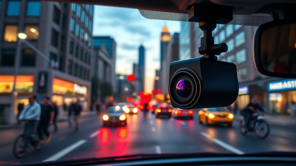 Ever wonder how much detail a dash cam can capture? Higher resolutions like 4K or 2.5K let you see license plates and road signs clearly, which is vital for evidence. Smooth footage helps when reviewing incidents, so a frame rate of 30fps or higher is ideal. Many models now include wide-angle lenses—ranging from 140° to 170°—which provide broader coverage of the road and reduce blind spots. Loop recording ensures continuous high-quality footage by overwriting old files automatically, so you don’t have to worry about running out of space. Low-light conditions are no longer a challenge thanks to night vision tech like STARVIS or HDR sensors, which improve visibility in dark environments. Overall, excellent video quality is indispensable for accurate documentation and safe driving.