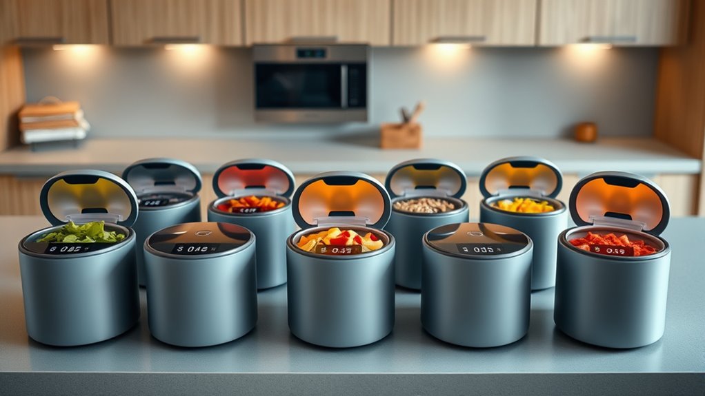 Processing speed is a key factor because it determines how quickly your kitchen waste gets transformed into compost. Some models can convert waste in as little as 3 hours, while others take up to 7 hours. Faster processing usually requires powerful motors and multiple blades that can shred and grind food waste efficiently. Features like turbo or high-temperature modes can further speed up composting, saving you time. Keep in mind, larger capacity bins may take longer to process the waste they hold, but they’re better suited for frequent use. Quick processing times make composting more convenient and encourage regular use, but they often come with higher energy consumption and more robust components. Balancing speed, efficiency, and energy use is essential when choosing the right bin.