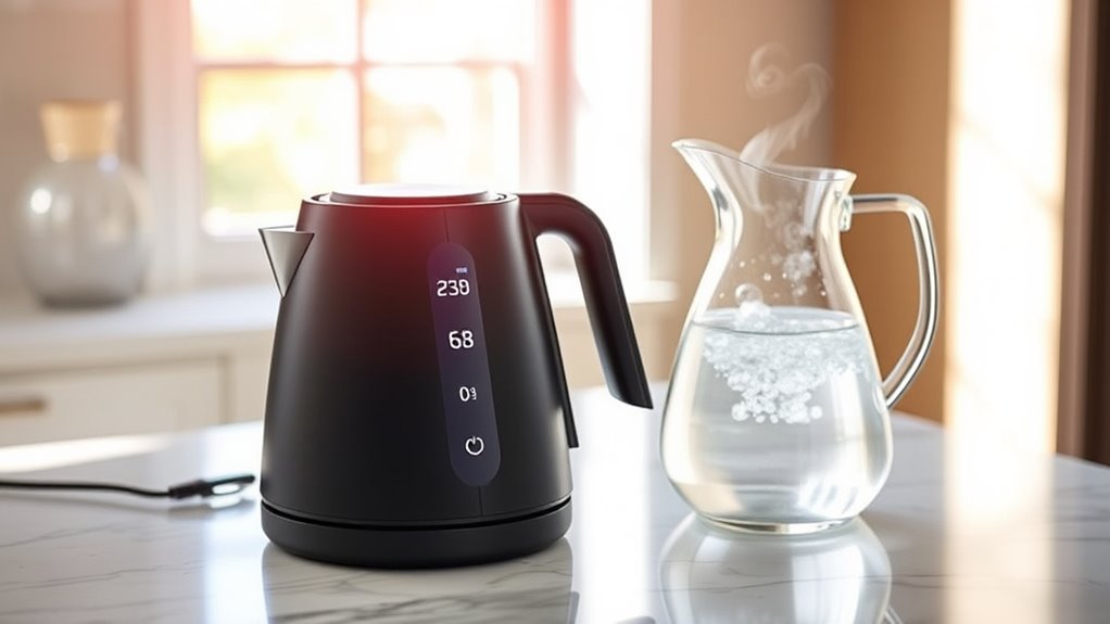 A kettle’s heating speed can considerably impact your daily routine, especially when you need hot water quickly. Higher wattage models, typically between 1500W and 1800W, can boil 1.7 liters of water in just 3 to 6 minutes, saving you time. Advanced heating elements with rapid boil technology further cut down heating times compared to standard kettles. Double-wall insulation and optimized heating circuits help improve efficiency by reducing heat loss. Precise temperature control also allows for quicker adjustments to your desired temperature, decreasing overall heating time. Additionally, kettles with dedicated fast-heating bases ensure minimal energy use while achieving rapid water temperature increases. When prioritizing speed, look for these features to streamline your morning routine and save valuable time.
