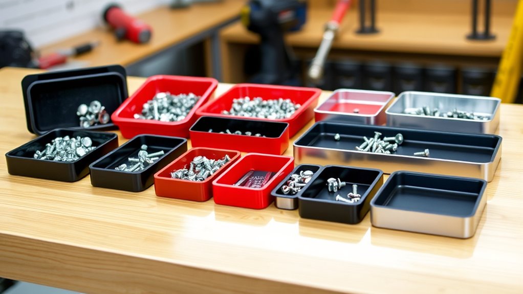 Magnetic parts trays come in a range of sizes, from small 3-inch bowls to large over 11-inch trays, making it easy to find one that fits your specific needs. Smaller trays are perfect for organizing tiny components or working in tight spaces, offering portability and convenience. Larger trays provide greater capacity, ideal for holding multiple nuts, bolts, or screws during extensive projects. The capacity depends on the tray’s dimensions and magnetic strength, influencing how many parts it can securely hold. When choosing a size, consider the scope of your work and the volume of small parts you need to manage. A smaller tray keeps things compact and portable, while a larger one offers more organization for big jobs. Select based on your project size and storage needs.