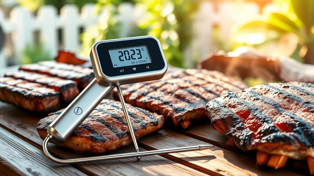 If you’re looking for the best meat thermometers for grilling in 2025, I highly recommend models featuring Meater technology, like the MEATER Pro XL and MEATER Block, for their accuracy and multi-probe design. Along with ThermoPro options, these devices offer long-range connectivity and durable builds for outdoor use. Whether you want WiFi, Bluetooth, or RF signals, these top picks provide reliable, real-time monitoring. Keep going to find out more about each standout and how they can upgrade your grilling game.