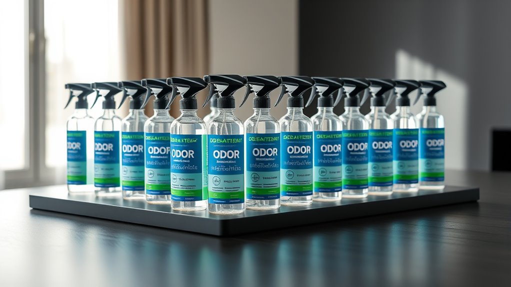 Choosing an odor eliminator spray that truly works hinges on understanding how effectively it neutralizes odors at their source. Effective sprays chemically target odor molecules, providing long-lasting freshness instead of just masking smells. The best products use advanced technologies like Odor Absorbing Molecules (OAM) or proprietary formulas designed to neutralize a wide range of malodors, from smoke to pet odors. Natural, enzyme-free, or biological ingredients can eliminate odors more completely and safely, especially in sensitive environments. The effectiveness is often backed by user reviews and independent tests that confirm their ability to remove stubborn smells. Proper application is essential—targeted spraying and sufficient contact time *considerably* enhance a spray’s ability to permanently eliminate odors, ensuring lasting freshness.