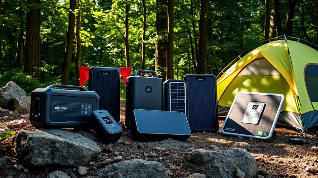Selecting a portable power station with versatile recharging options can substantially enhance its usability, especially in outdoor or emergency situations. I look for devices that support multiple recharging methods like AC outlets, solar panels, and car adapters, providing flexibility in various environments. It’s important to check recharging times—some stations recharge in under two hours via AC, while solar charging depends on sunlight and can take longer. Fast-charging features like PD ports or rapid AC recharge can minimize downtime. Compatibility with solar panels matters too; I ensure wattage limits and connector types match my setup for efficient outdoor recharging. Finally, considering the battery cycle lifespan, often 3,000–4,000 cycles for LiFePO4 batteries, helps me gauge long-term durability and overall device longevity.